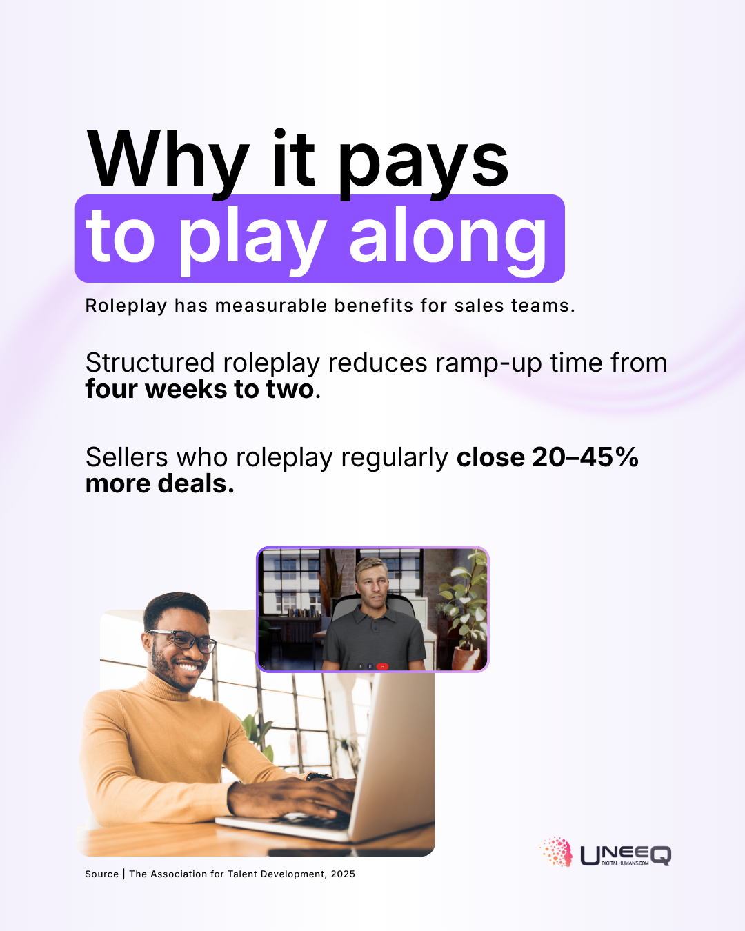 The Association for Talent Development similarly found the benefits of roleplay: reducing ramp time in new hires by 50% and improving actual deal closure rates by as high as 45%.