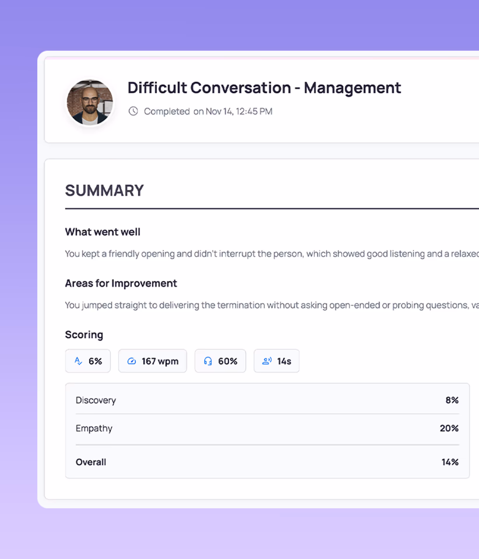 After each session, leaders receive detailed performance scorecards showing communication effectiveness, empathy demonstrated, active listening scores, and specific areas for improvement. The trainee and their managers can track progress over time and identify coaching opportunities with comprehensive analytics.
